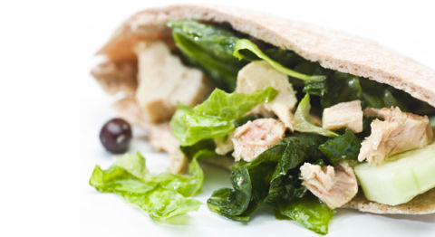 • Tuna pita: 1 mini whole wheat pita, 2 ounces water-packed light tuna, 1 tablespoon light mayonnaise, mustard, and cucumber and onion slices